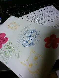 土曜日、仕事から帰宅してから(新刊は無理だけどペーパーもどきを作るぞ!)と意気込んで、好きなものについて好きなように書き綴り、そしてイラストなんかも描いちゃったりして(シャーペンですが)、それをスキャナに取り込んで~なんていう作業をし、プリントアウトを終えてから本文4枚中2枚を諸事情により文章をいじり直し、翌早朝…6時過ぎに訂正分を刷り直して製本。